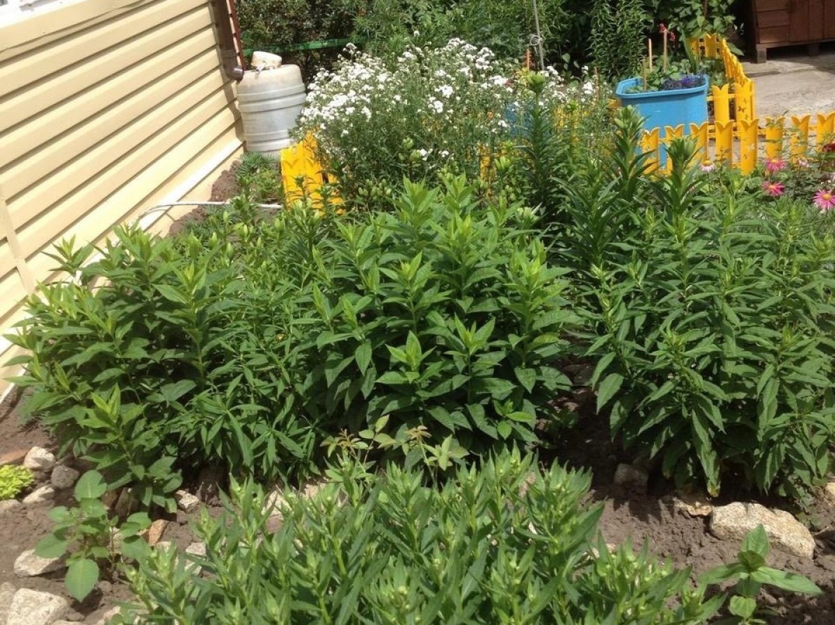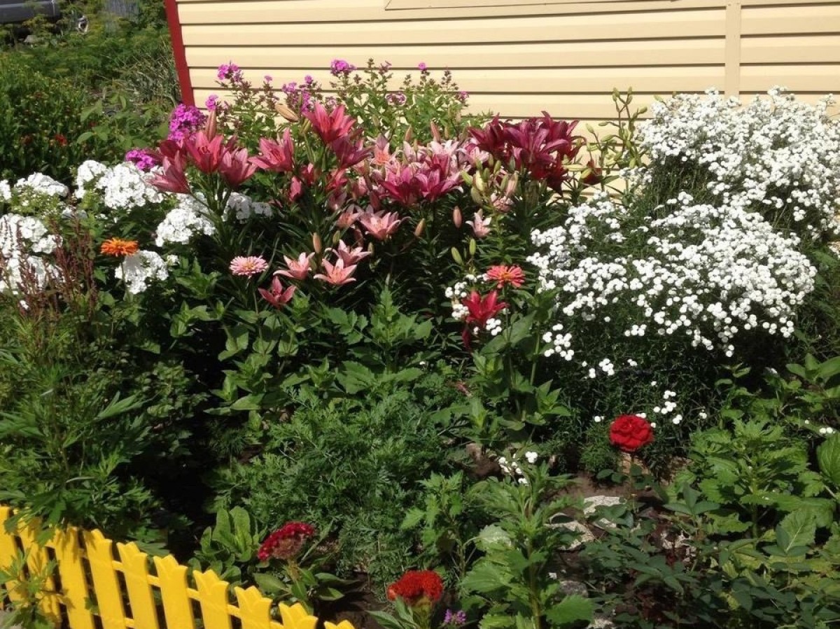 Огорожены палисадники с большим количеством разнообразных цветов.